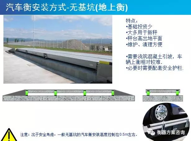 無基坑注意事項(xiàng):需要澆筑混凝土引坡,車輛上衡相對(duì)較難.必要時(shí)需要配套安全護(hù)欄。出于安全考慮,一般無基坑的汽車衡安裝高度控制在0.5m左右。